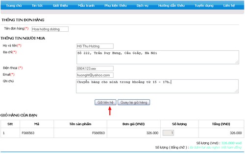 Bước 4: Điền thông tin cá nhân và nhấp "Gửi liên hệ" để hoàn thành quá trình đặt hàng.